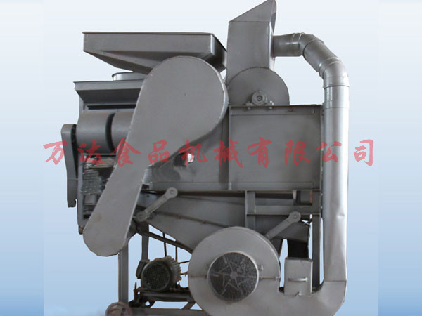 結(jié)構(gòu)及工作原理:本機采用紋纖、柵條、凹板、風機、比重分選篩及二次提升機等幾部分組成,結(jié)構(gòu)簡單緊湊、性能穩(wěn)定、安全可靠。工作原理:花生果由人工喂料,先落到粗紋柵里,由于紋板轉(zhuǎn)動與固定柵條凹板間的搓力,將花生殼剝離,分離后的花生仁與殼同時經(jīng)過柵網(wǎng)落下,再經(jīng)過風道由風力將大部分花生殼吹出機外,而花生仁和一部分尚未剝離的花生小果一起落入比重分選篩進行精選,經(jīng)過重篩選后,花生仁由分離篩面上行,通過料口流入麻袋,而尚未剝開的花生小果,則由篩面下行,經(jīng)過出料道口流入提升機。再由提升機送入細紋柵進行二次剝殼,再經(jīng)過比重分行篩分選,既可達到全部剝殼。